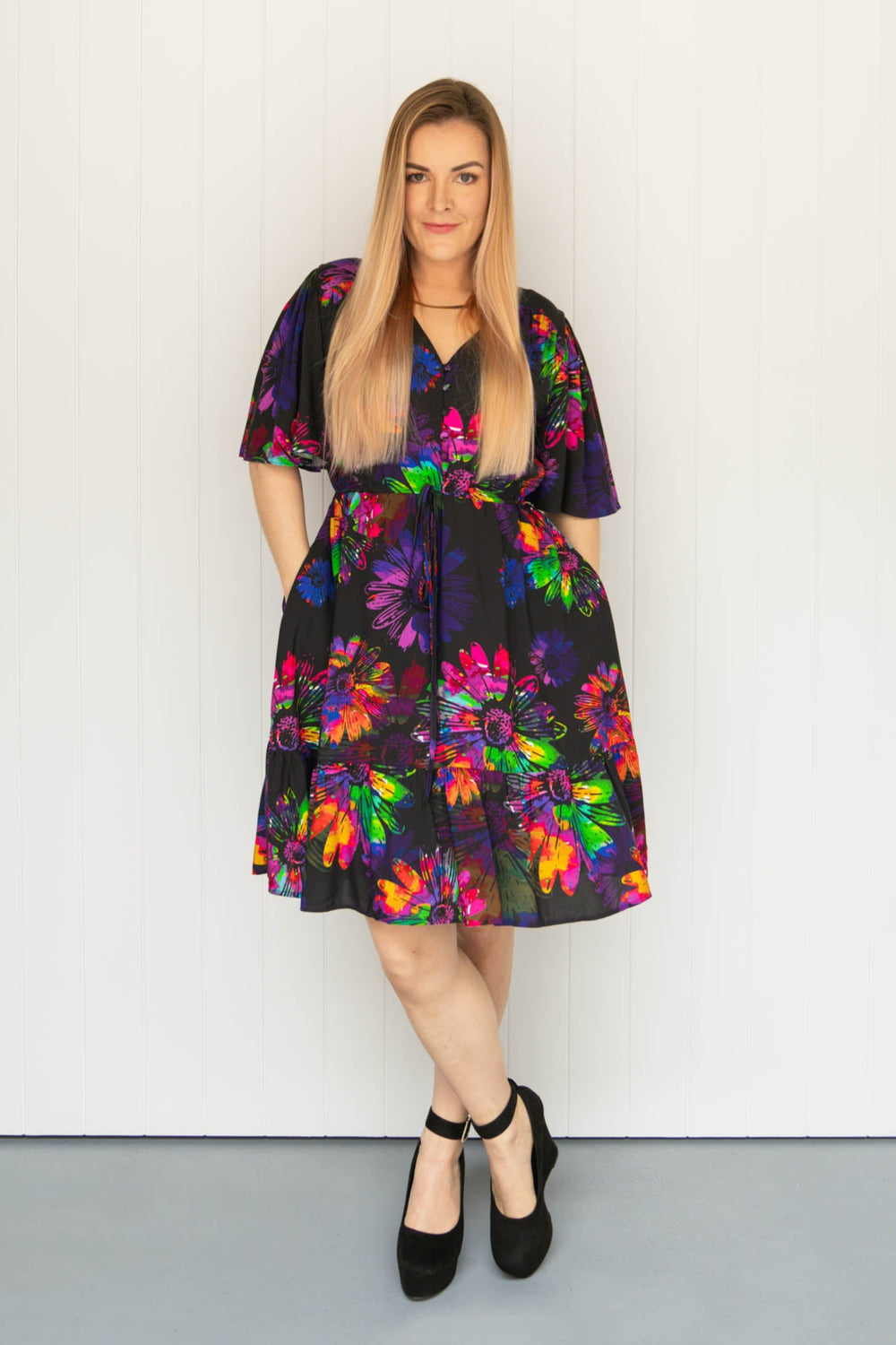 A model wearing a multicolored mini dress with a floral pattern, featuring a V-neckline, wide sleeves, a drawstring waistband, and a tiered hem.