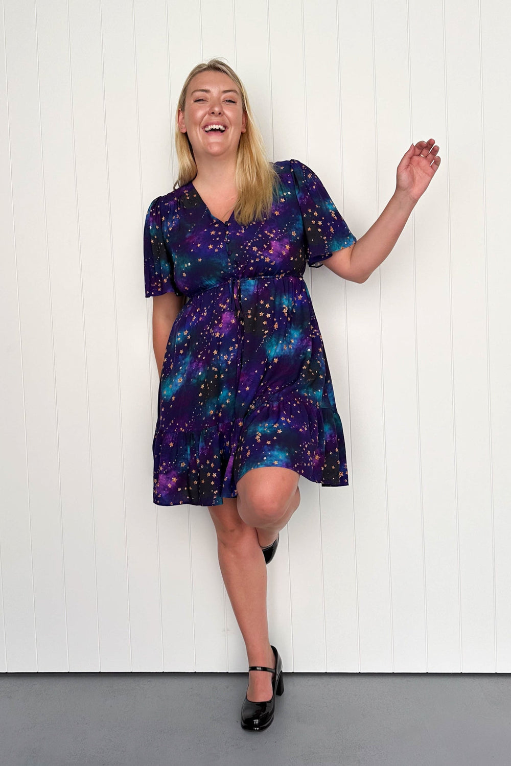 A model wearing a mini dress with a relaxed fit, tiered hem, and a universe shimmer print consisting of purples and blues with gold stars.