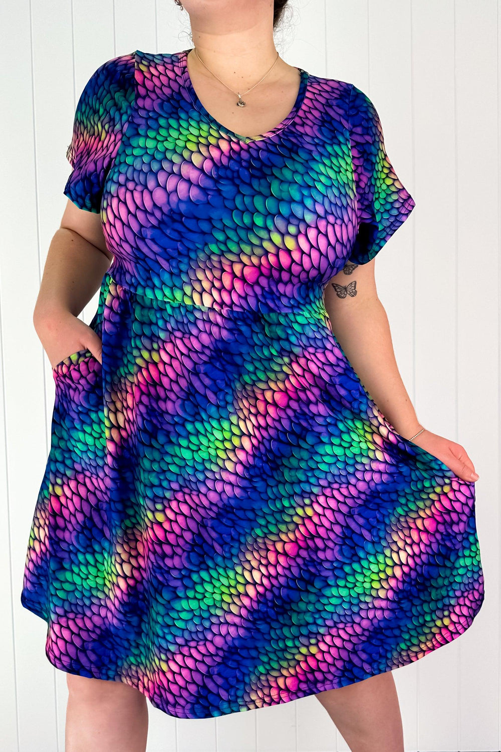 A sleeveless mini dress with a multicolored dragon scale pattern, featuring side pockets.