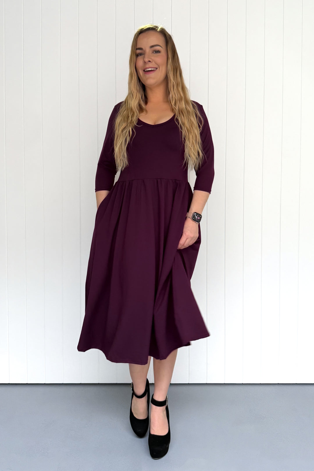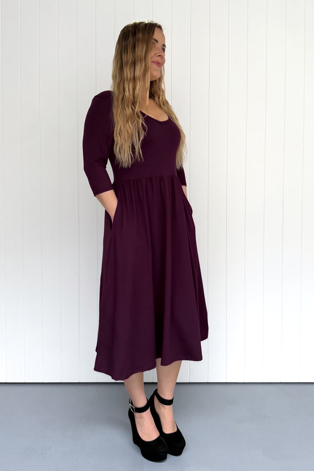 Plum - 3/4 Sleeve - Midi Dress - Pockets