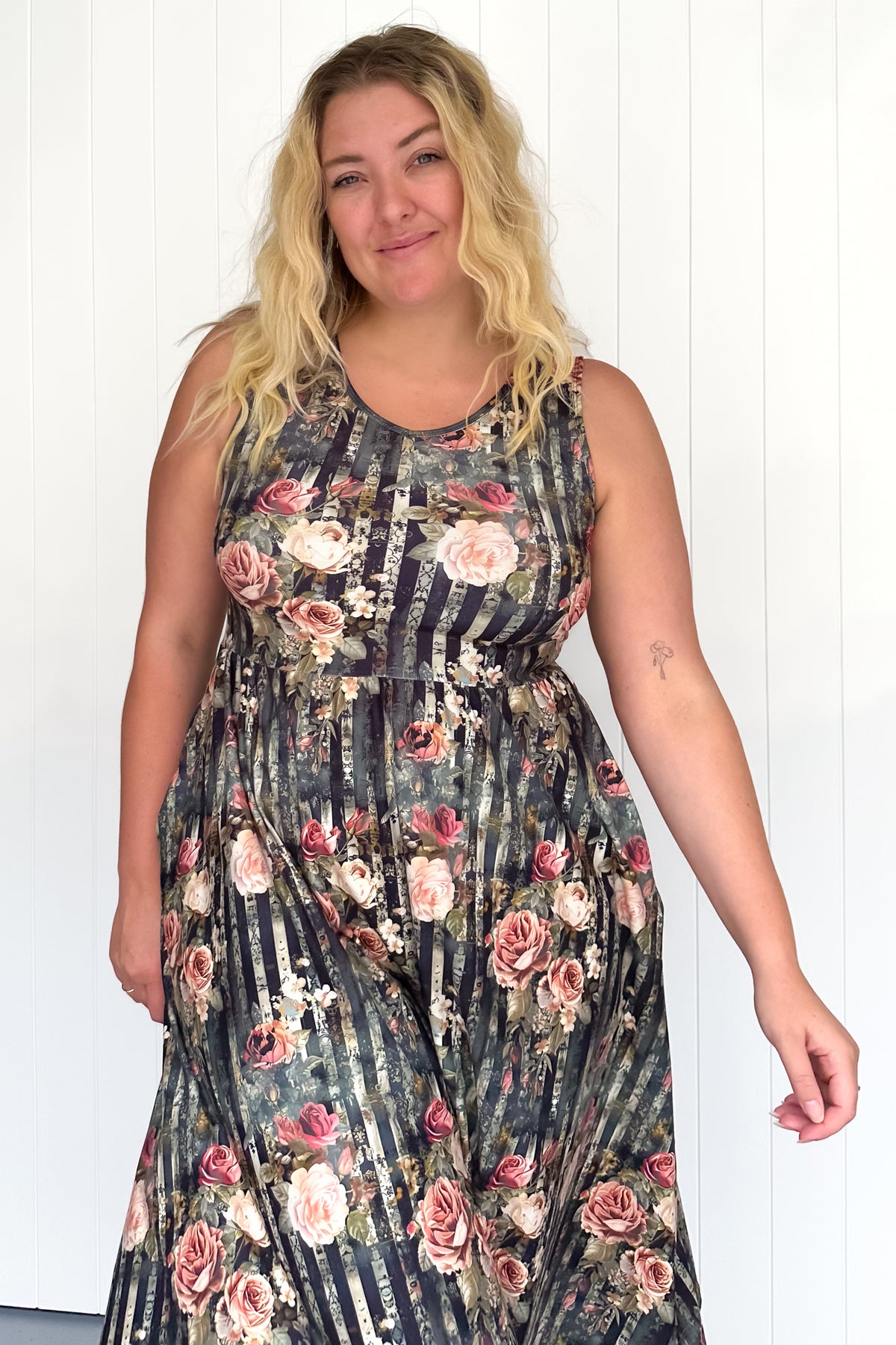 A sleeveless midi dress with a floral pattern in pinks and creams over dark vertical stripes, featuring a round neckline and deep side pockets.