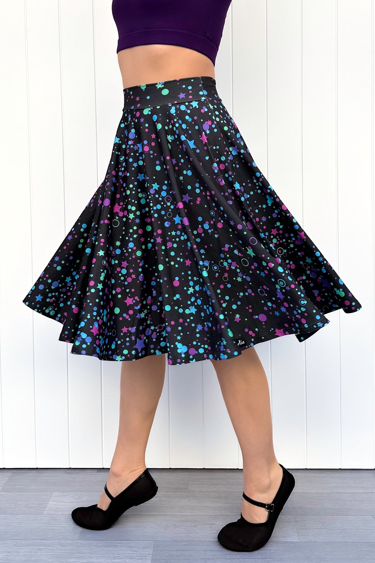 The Seraphine Knee-Length Skirt in Neon Galaxy brings a burst of interstellar fun to your day. Scattered stars and playful pops of colour light up the dark base, creating a skirt that feels alive with cosmic energy. The soft, stretchy fabric moves like a dream, while the waistband keeps it feeling smooth and secure.
