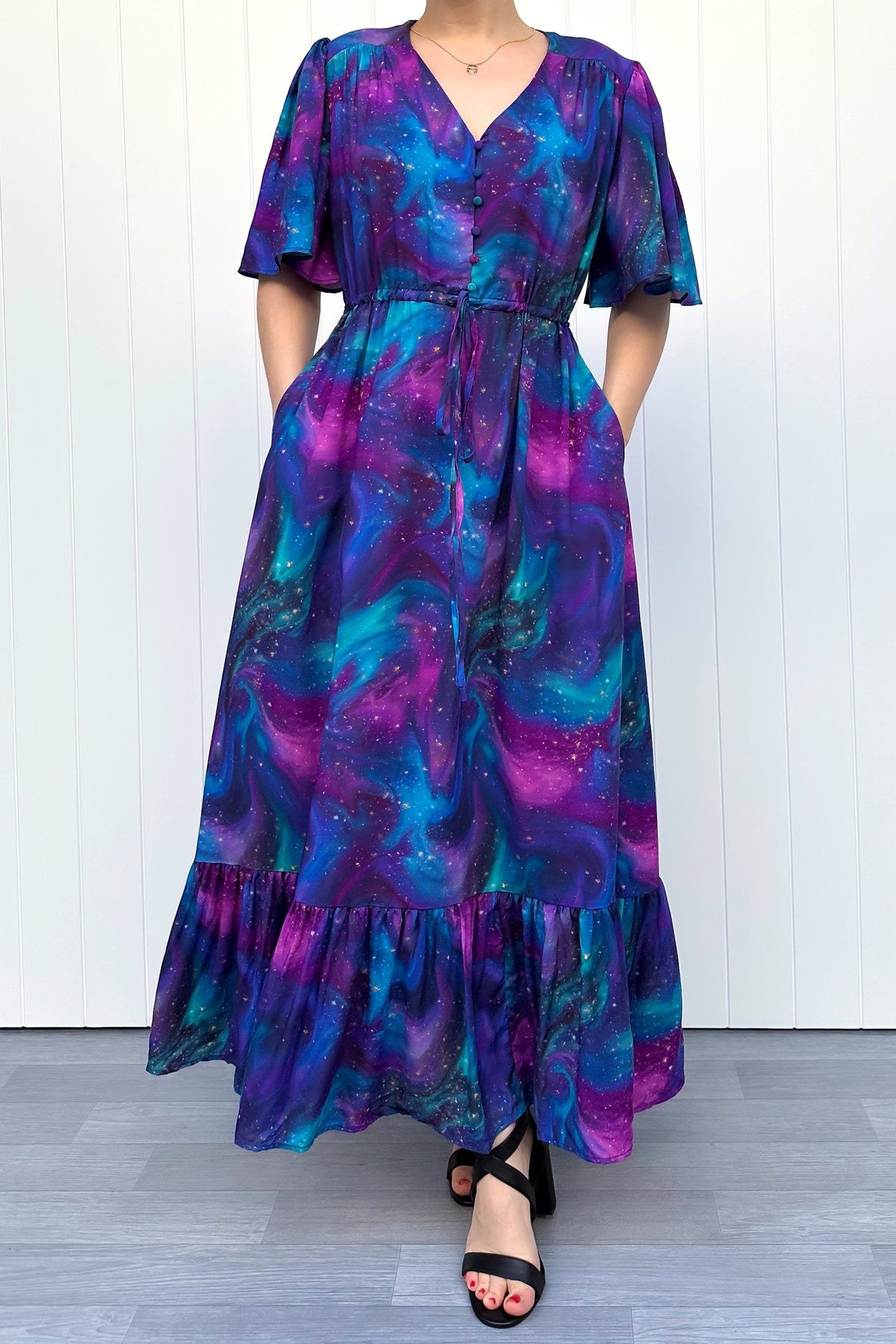 The Aurora Sky Peony Maxi Dress swirls with cosmic blues, purples and soft flashes of light, creating a dress that feels alive with depth and movement. It’s dreamy without being delicate and bold without being loud, made for moments when you want your outfit to feel just as special as the night ahead. Crafted from soft touch rayon, it's breezy and beautifully breathable, softer and quicker drying than cotton. Fabric covered buttons are backed with a modesty panel for confident wear, while subtle puffed sleeves and a ruffled tier hem add movement and romance.