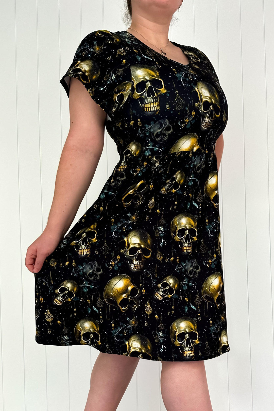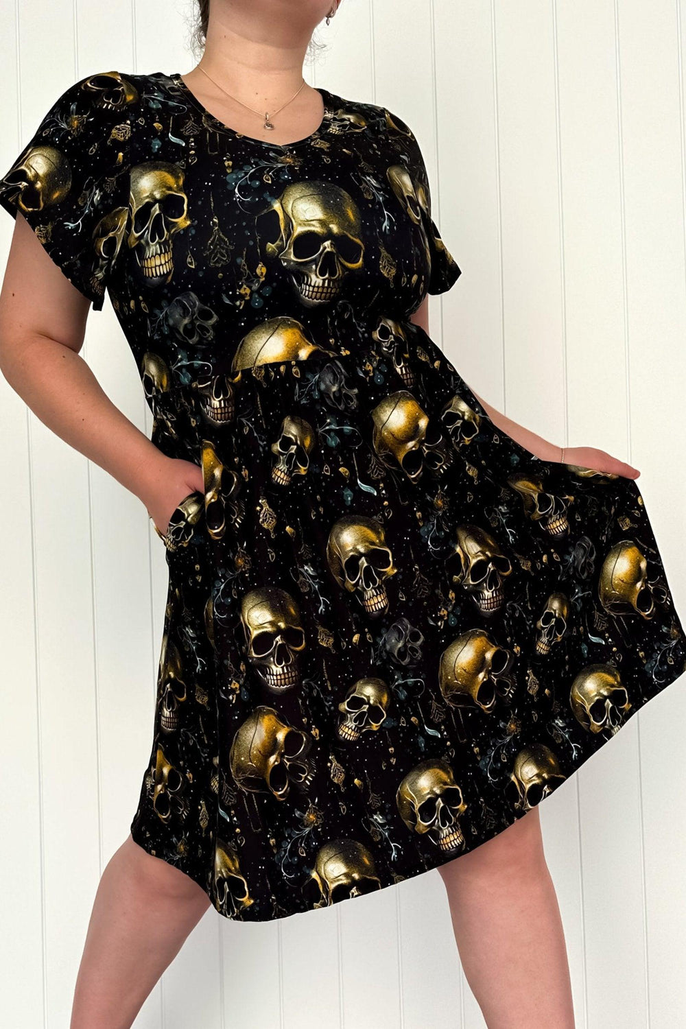 Skull Trinkets Knee Length Dress features gold skulls surrounded by small silver and gold printed trinkets with flowy short flutter sleeves, pockets and a soft v-neck line in a knee length skater style design.