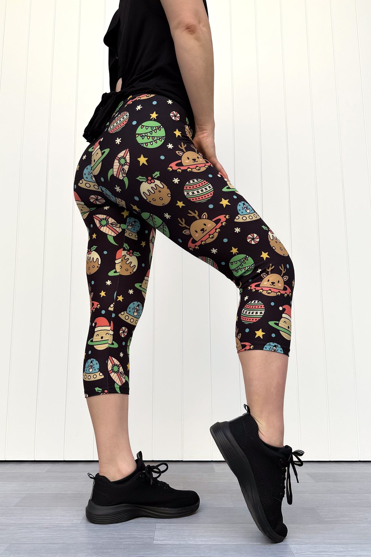 The Space Christmas Capri Leggings will take you on an adventure across galaxies filled with rockets, reindeer, puddings and baubles. Playful, bold and comfortable, they’re ready for any festive moment, from holiday shopping to Christmas morning fun.
