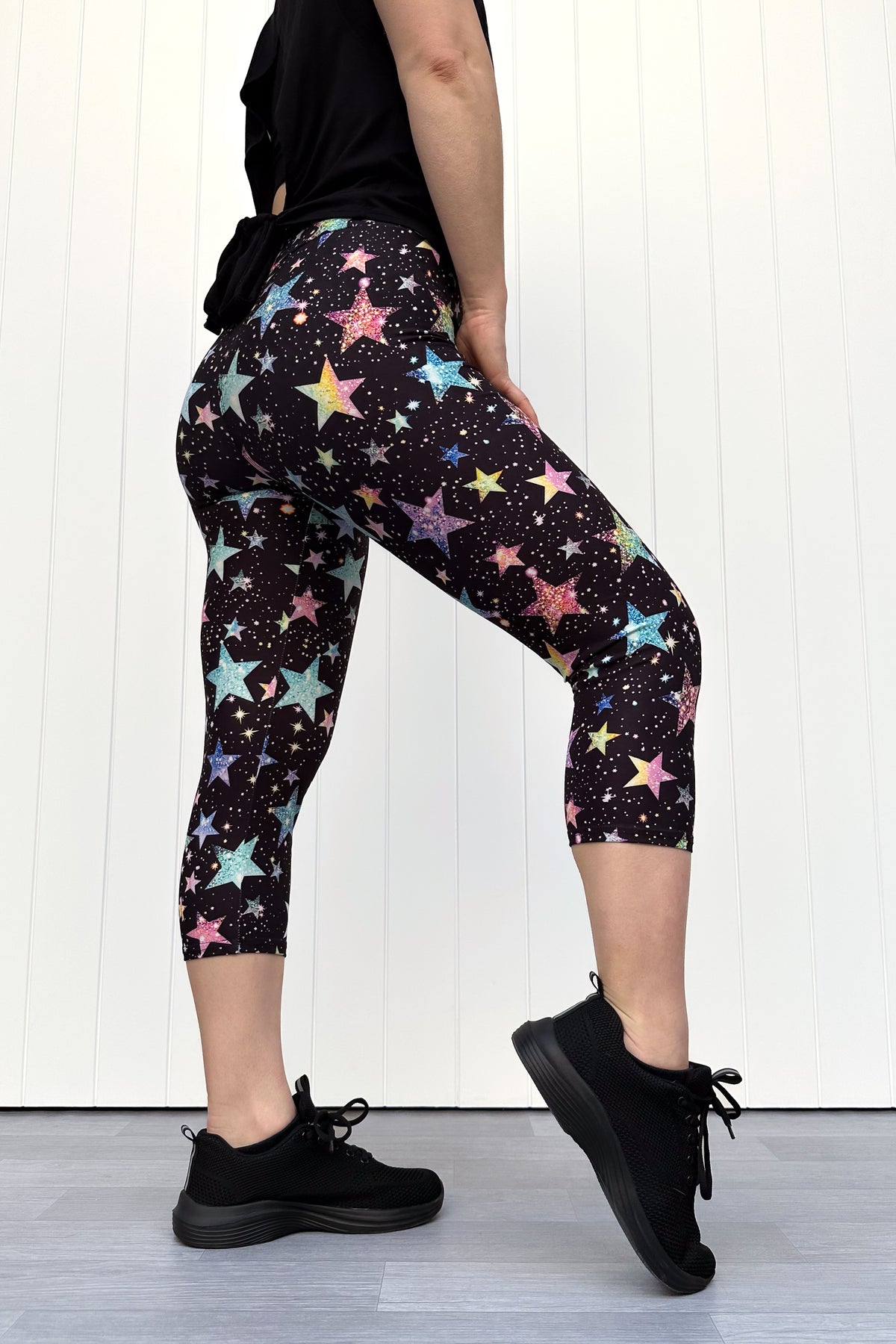 Person wearing black capri leggings with colourful sparkle-like star pattern, standing against a white wall.