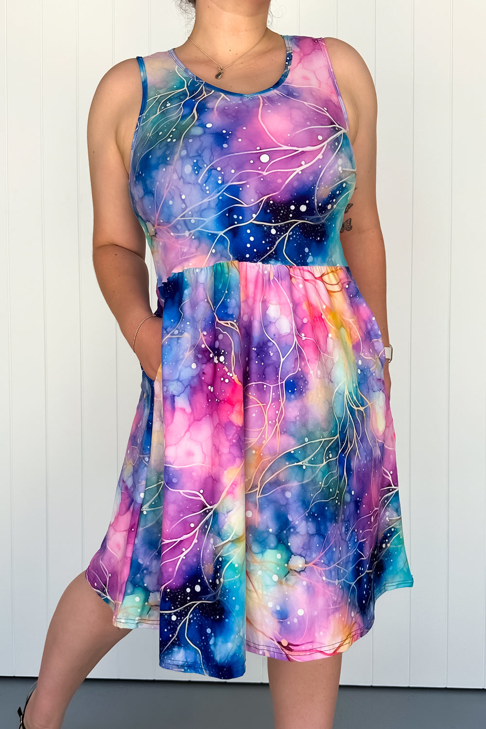 Remember those tie-dye tees you made in the backyard with rubber bands and a whole lot of hope? This is the grown-up, can actually wear outside the house version. The Spellbound Sleeveless Knee Length Dress with Pockets blends vibrant colours with gentle white line detailing that feels part hand-drawn, part whimsical. It’s eye-catching in the best way, and comfier than anything you wore in the '90s.