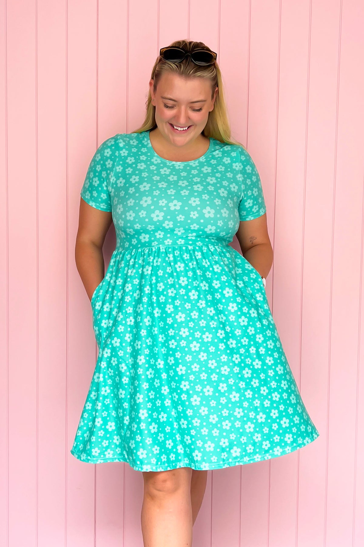 You know those days when you wake up, the sun is shining, and everything just feels a little brighter? The Turquoise Daisy Confetti Knee Length Dress is that feeling in dress form. The cheerful daisy design sprinkled across a refreshing green-turquoise base makes it an easy choice when you want something fun without being too loud. And if you're someone that prefers wearing shorts under your dress for extra comfort, you can pair it with the matching shorts*.
